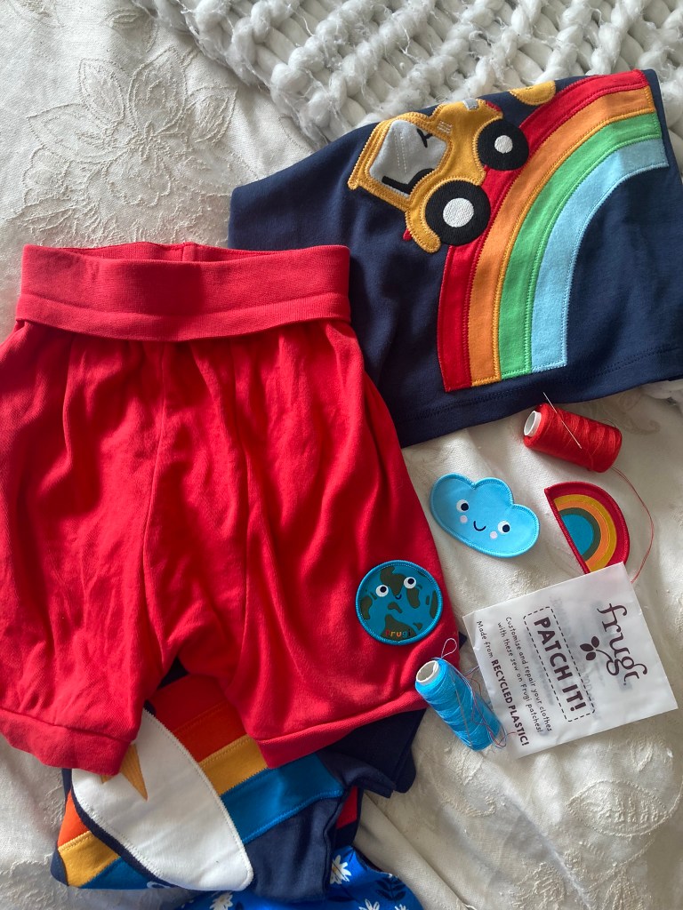 Did you know…. An estimated €140 million worth of clothing ends up in landfills each year with less than 1% being recycled into new products. That means that 99% of all textile production goes to waste! These startling facts mean that it’s more important than ever to do our bit to extend the life of our clothing wether that is by re-homing them, upcycling them in to something else or mending them when they are broken. I personally love using repair patches to mend clothing, especially that of my children, as they are quick and easy to use and cute too. Frugi’s new repair patches are cleverly made from post-consumer recycled plastic bottles and they have a cotton backing, meaning that you can remove them and re-use them again and again as children outgrow their mended clothes.