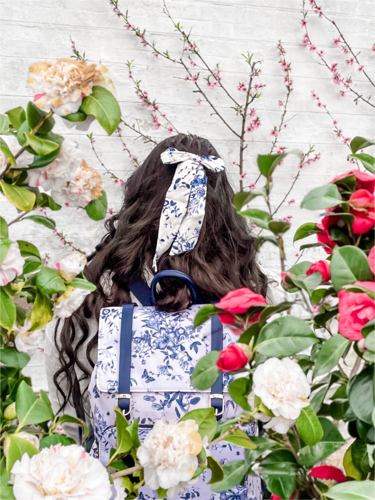 …….. this backpack from Fable England is a beautiful daily essential. It has a delicate toile print that features elegant floral bouquets, trailing vines and is dotted with dragonflies, bees and butterflies in a classic palette of tonal blues. The backpack is large enough to double up as a changing bag for the day, making it practical too. It has a zipped front pocket as well as 2 inner pockets. It has a vintage charm to it with the faux buckle detail at the front.